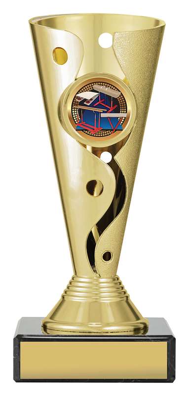 Carnival cups present a distinctive cup style trophy with attractive 3D design – on classic black marble base for your engraving – with brightly coloured insert for your sport. Trophies adaptable to your custom requirements.